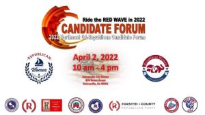 2022 Northeast Georgia Republican Candidate Forum10:00 am - 4:00 pmThe purpose of the 2022 NRCF is to engage, educate, and energize the voters. Statewide Executive candidates will be given an opportunity to speak about their platform and answer specific questions presented by a moderator. This is not a debate but an opportunity for voters to meet and listen to the candidates discuss why they are the best person for the job. The event is presented by the Republican Women of Hall County (RWH) and the Republican Women of Forsyth County (RWFC) and a number of County Republican parties in Northeast Georgia. Gainesville Civic Center